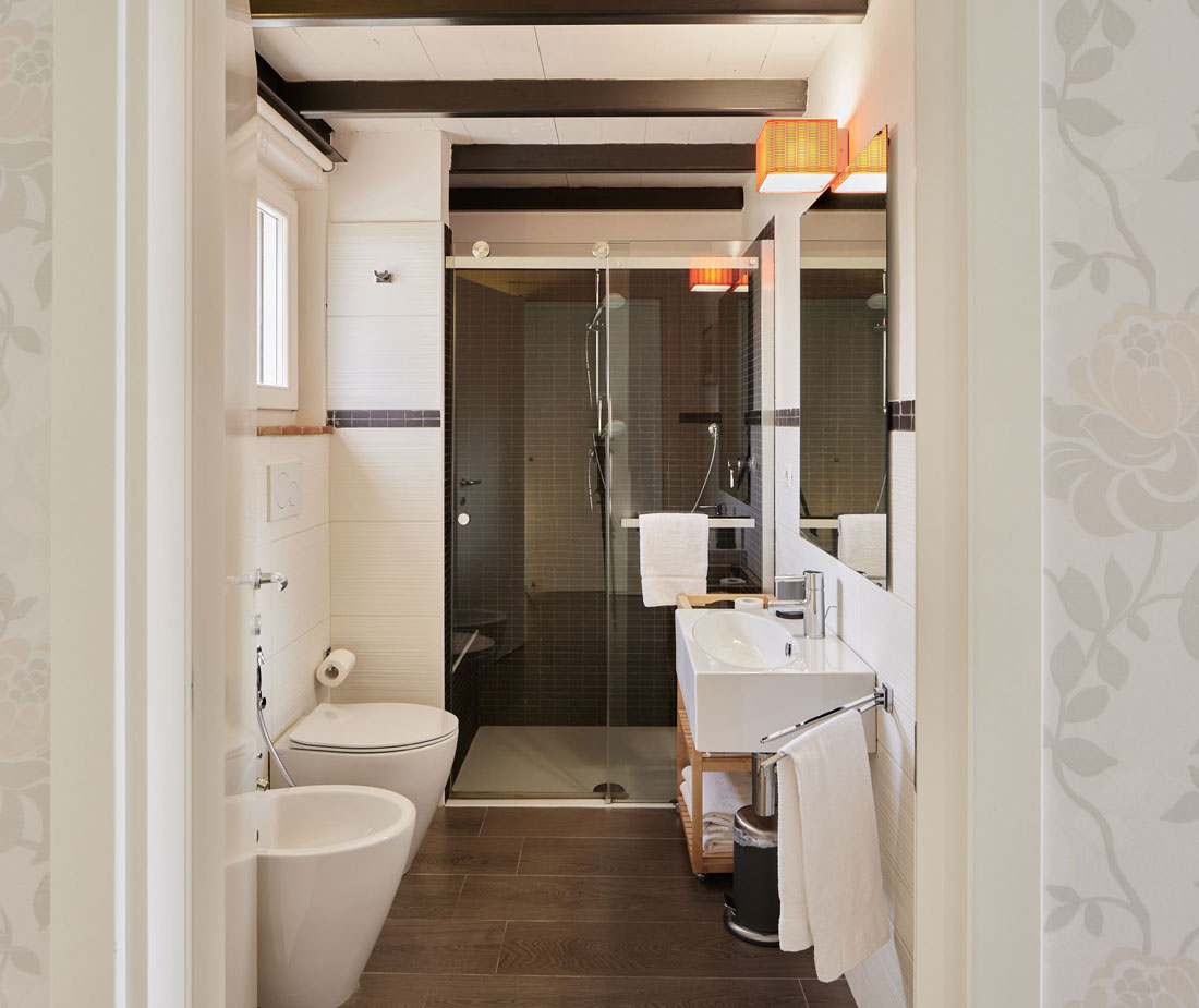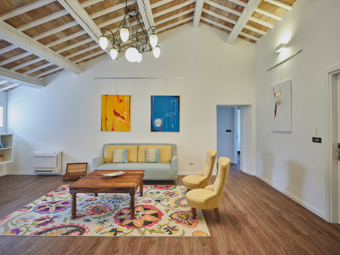 Im Obergeschoss, ebenfalls in diesem 390 m² großen Haus, befinden sich ein großer Aufenthaltsraum und fünf Doppelzimmer, jeweils mit eigenem Bad.
